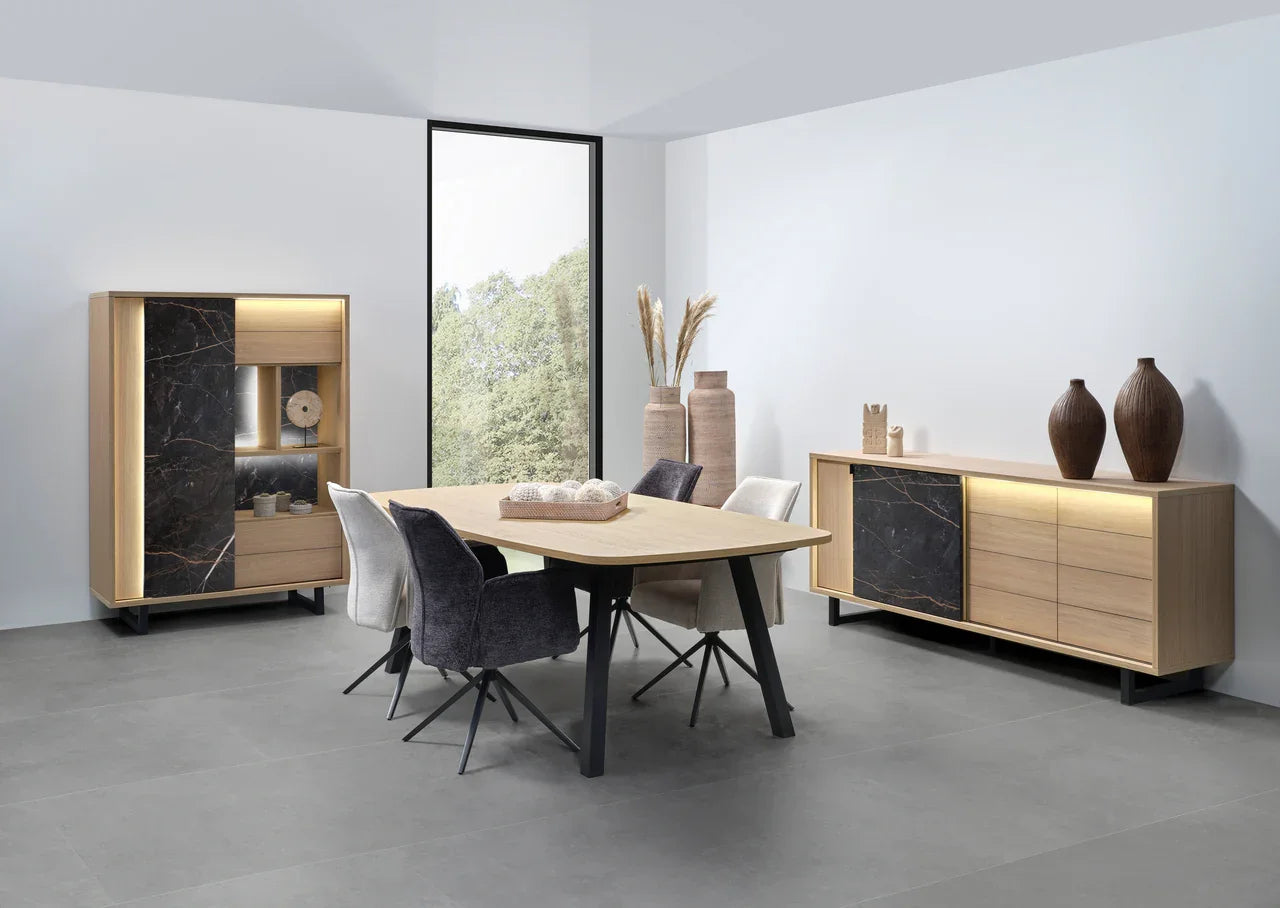 Barkast Tosca met ingebouwde LED-verlichting, afgewerkt met donker marmeren accenten. Een hele warme, duurzame barkast.