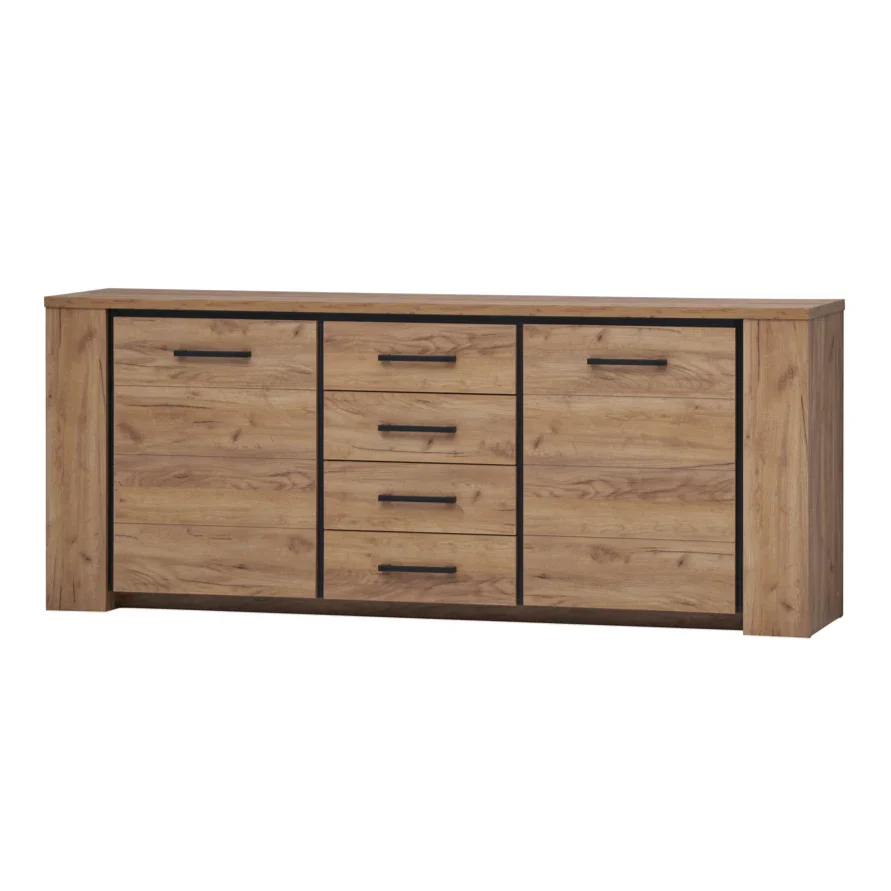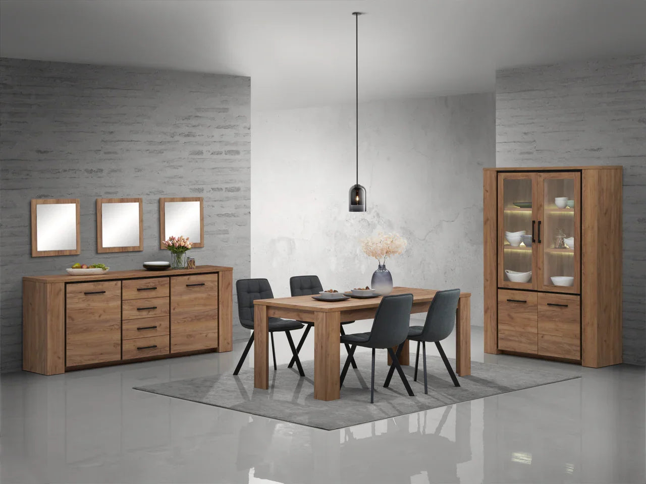 Breng tijdloze elegantie in je eetkamer met de eetkamerset Delvio. Deze set combineert een modern design met praktische opbergruimte, ideaal voor een stijlvolle en georganiseerde leefruimte. De set bestaat uit een ruim dressoir met 4 schuiven en 2 deuren, perfect om servies en andere benodigdheden netjes op te bergen.