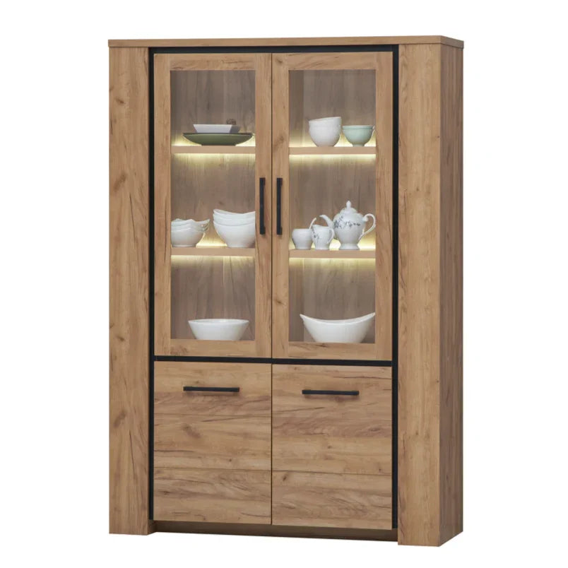De centrale blikvanger is de eettafel van 190 cm, ideaal voor gezellige diners met familie en vrienden. Voor wie meer ruimte wenst, is er ook een optie voor een ovale eettafel van 220 cm, die een luxueuze uitstraling geeft en meer plaats biedt. De glaskast met ingebouwde ledverlichting voegt een verfijnde touch toe en biedt de perfecte plek om decoratieve items of glaswerk te presenteren.