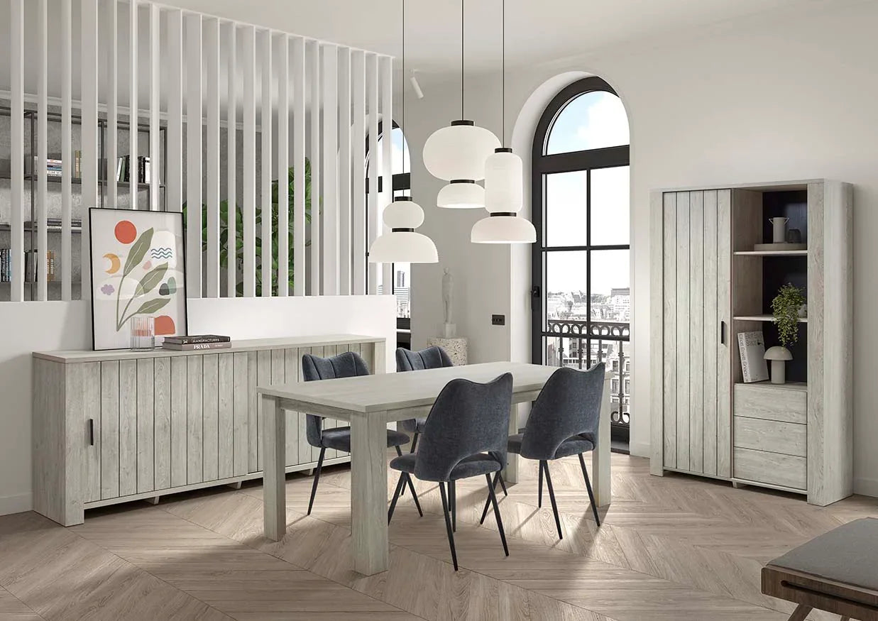 Eetkamerset Winston is een mooie actie eetkamer met een stevige dressoir van 225cm, een Vitrine kast van 120cm en een tafel van 190cm.