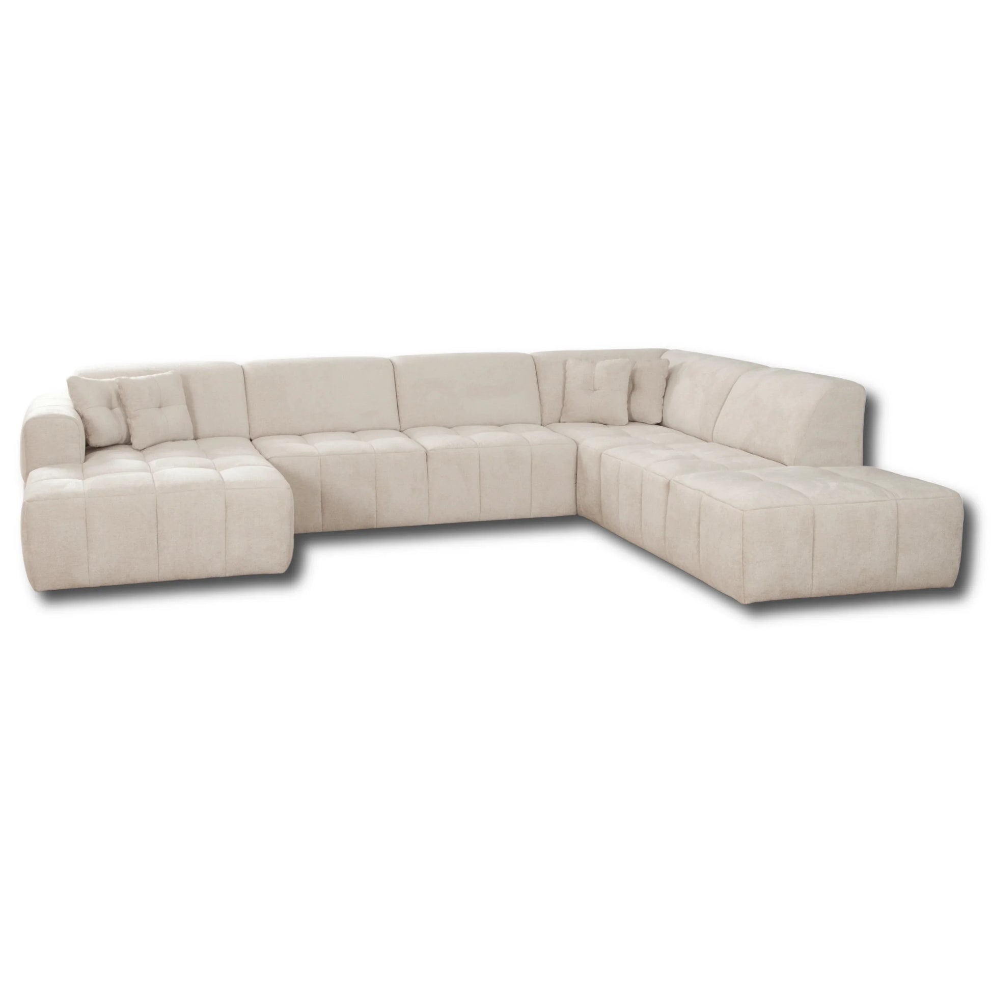 De U-Salon Kreta combineert modern design met ultiem zitcomfort. Met een brede longchair, 3-zit zonder arm en ottoman biedt deze salon een royale zitruimte van B380 cm x D175/232 cm – perfect voor ontspanning en gezellig samenzijn.