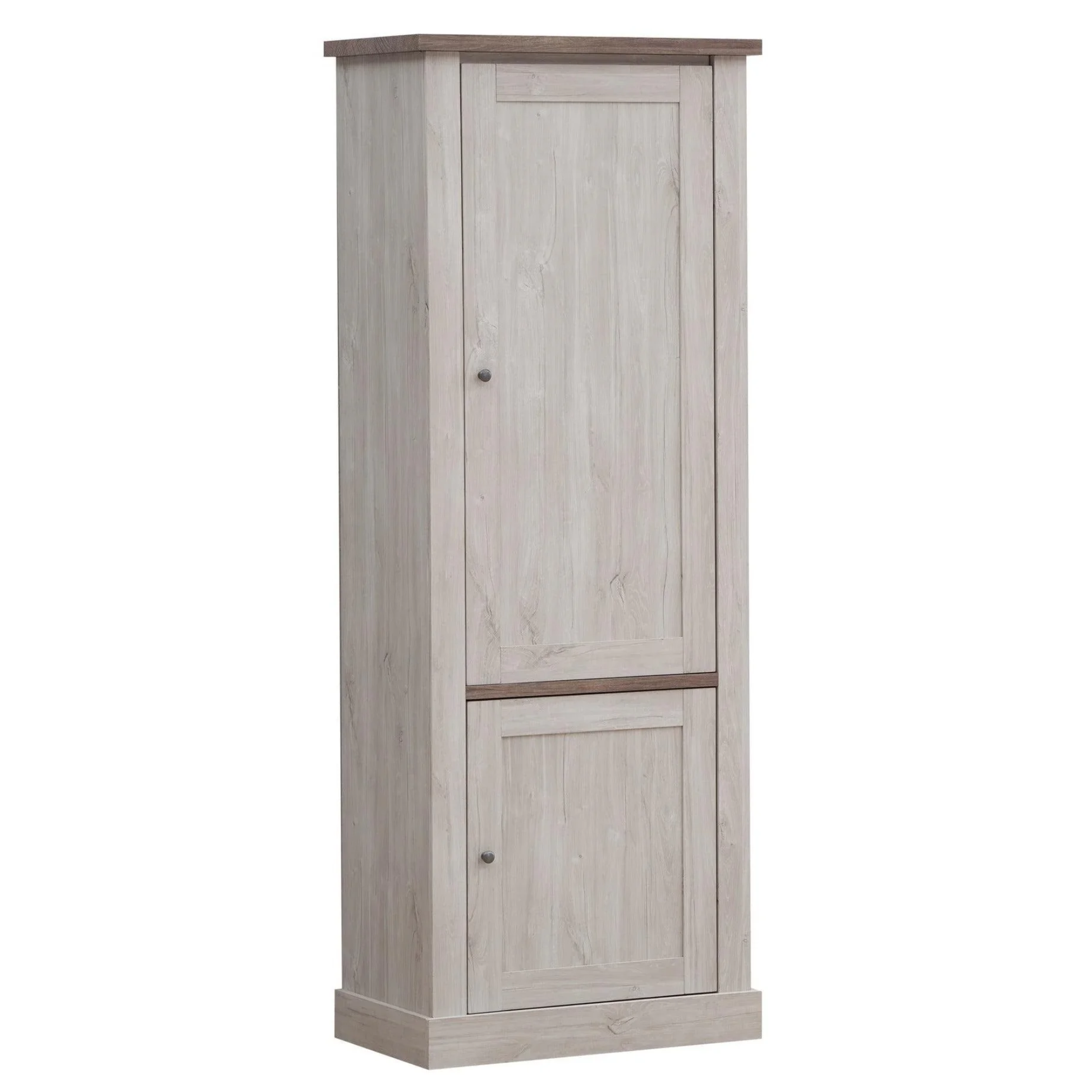Landelijke kast Johan heeft witte panelen gecombineerd met een donkerder houten blad. Deze vitrine heeft een houten voorkant om je spullen netjes in op te bergen.