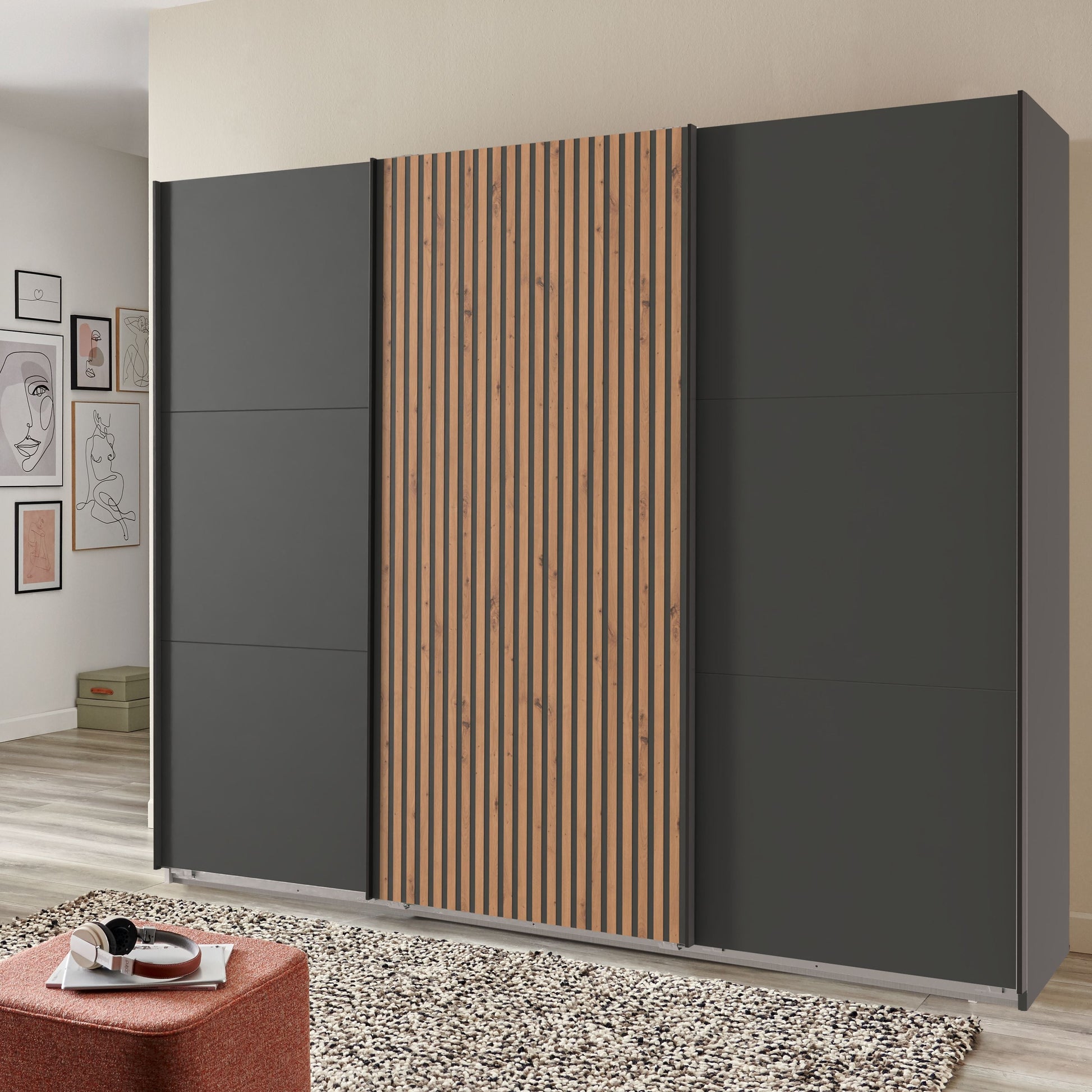 De kleerkast Dora heeft een robuuste romp en twee buitendeuren in een elegante antraciete kleur, die een vleugje moderniteit toevoegen aan elke ruimte. Het middelste compartiment is voorzien van akoestische latten in artisan eiken kleur, waardoor een uniek contrast ontstaat en een warme, natuurlijke uitstraling wordt gecreëerd.