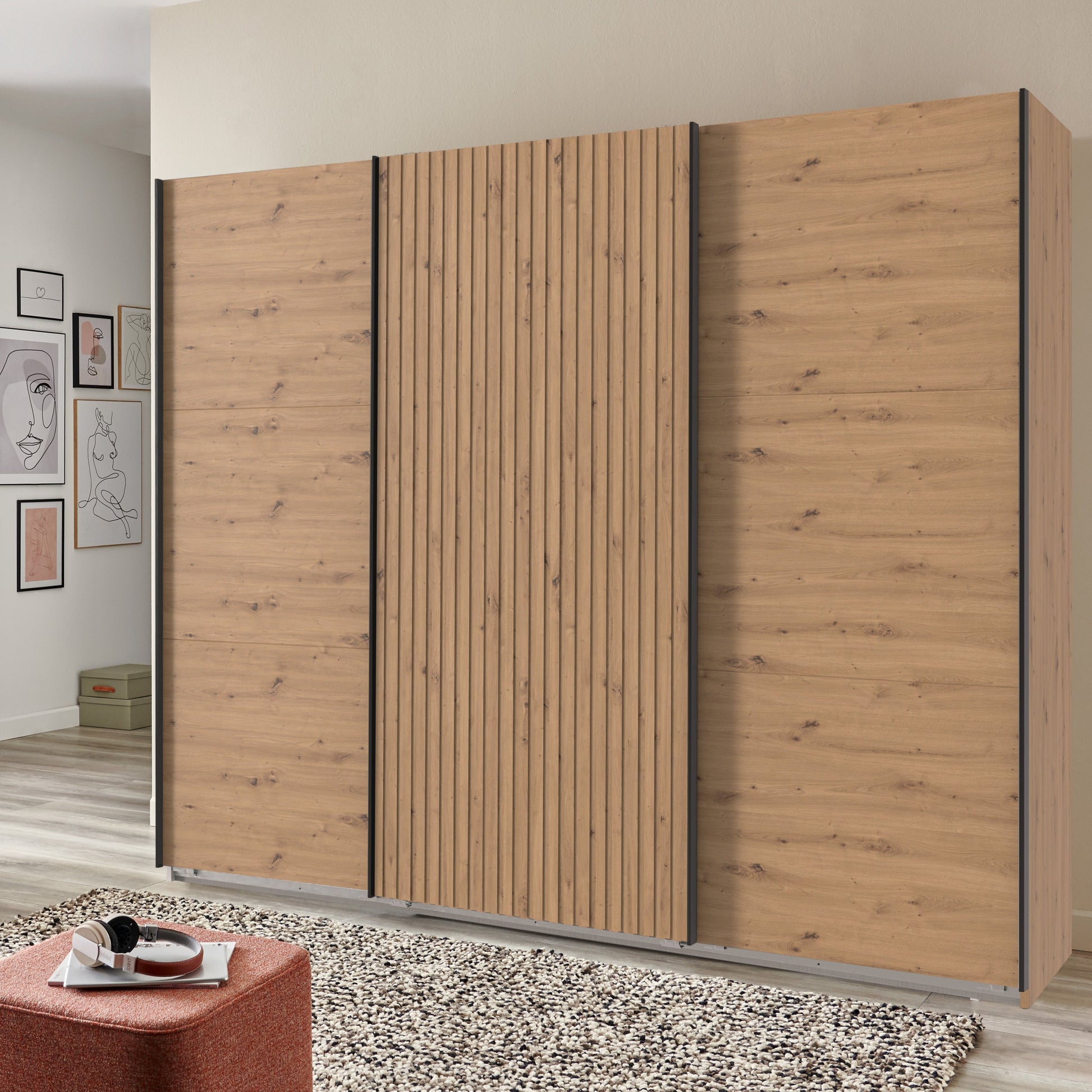 De kleerkast Dora is voorzien van een stevige romp en twee buitendeuren in een warme artisan eiken kleur, wat zorgt voor een tijdloze uitstraling die perfect past bij verschillende interieurstijlen. De middelste deur is uitgerust met akoestische latten, waardoor een visueel aantrekkelijk en functioneel element wordt toegevoegd dat geluiden dempt voor een rustige slaapomgeving.