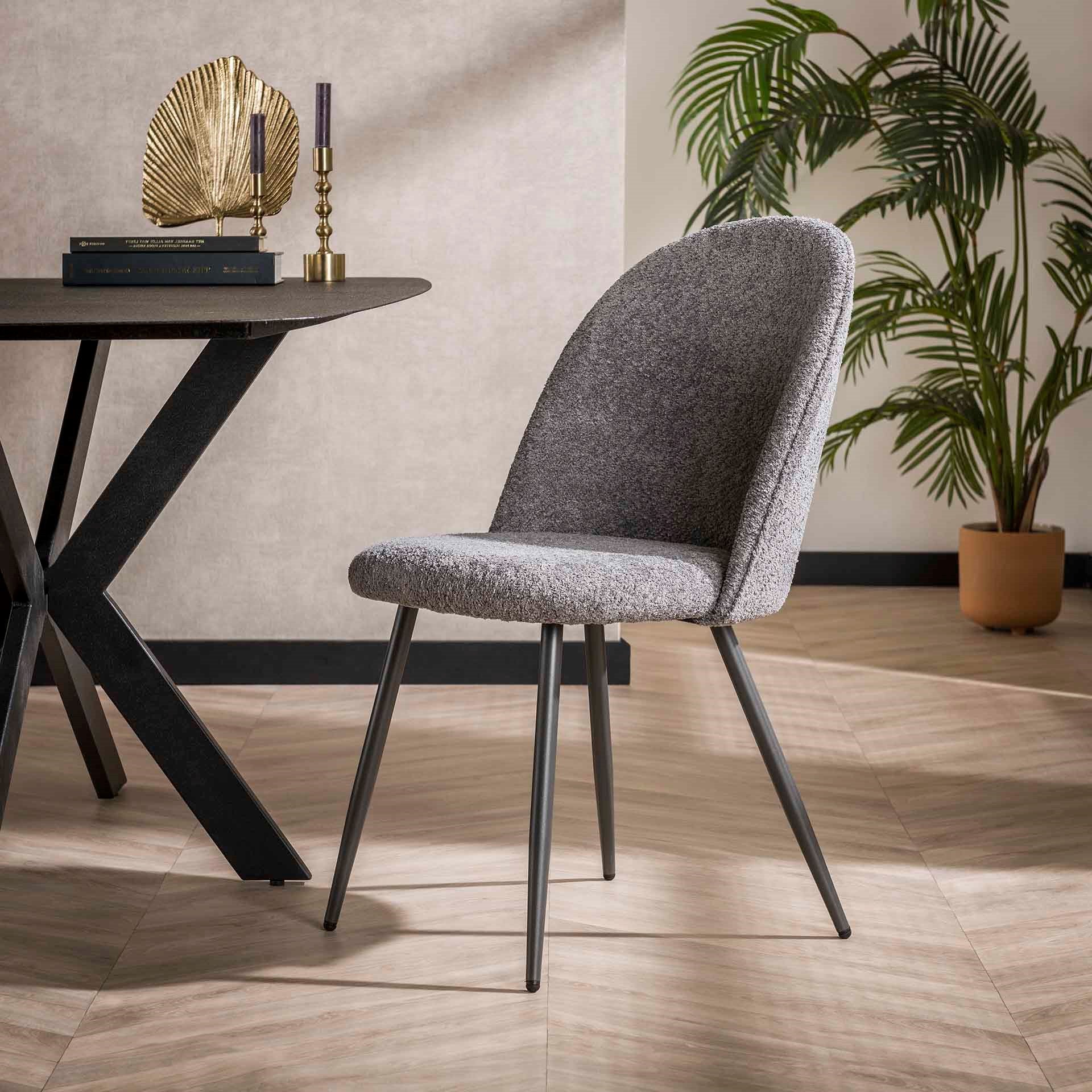 Deze stijlvolle bouclé stoel is perfect om elke ruimte in huis een moderne en comfortabele uitstraling te geven. De grijze bouclé bekleding straalt luxe uit en voelt heerlijk zacht aan. De stoel staat stevig op zijn elegante metalen poten, waardoor hij niet alleen mooi, maar ook duurzaam en stabiel is. De ronde rug past zich perfect aan aan uw lichaam.