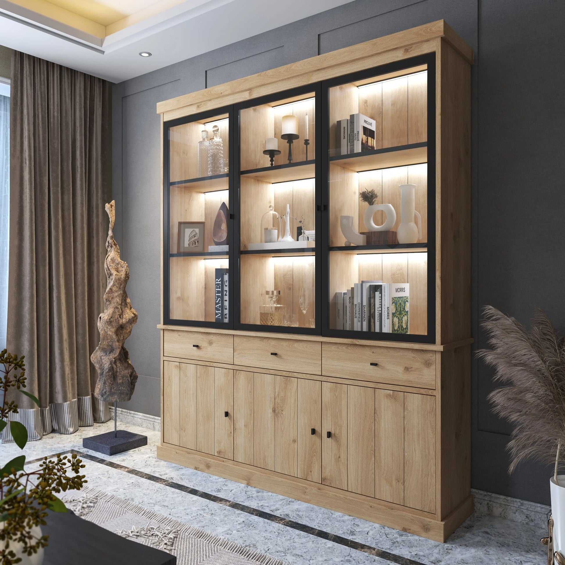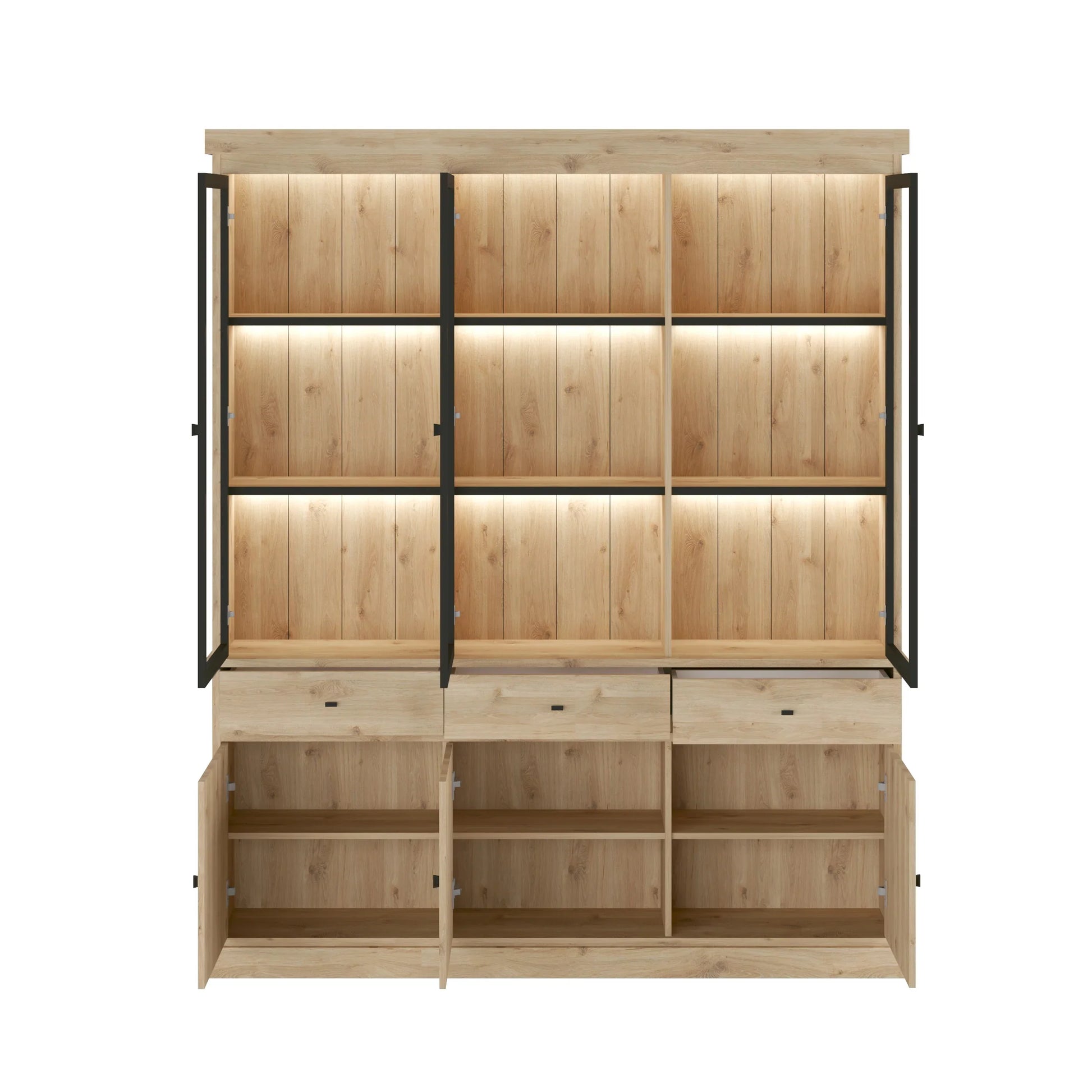 Bovenin is de vitrine voorzien van drie grote glazen deuren, waardoor je jouw favoriete decoratieve items kunt tentoonstellen. De ingebouwde LED-verlichting zorgt voor een sfeervolle ambiance en laat jouw collectibles schitteren, terwijl de lichte eiken kleur een vleugje natuurlijke charme toevoegt aan elke kamer.