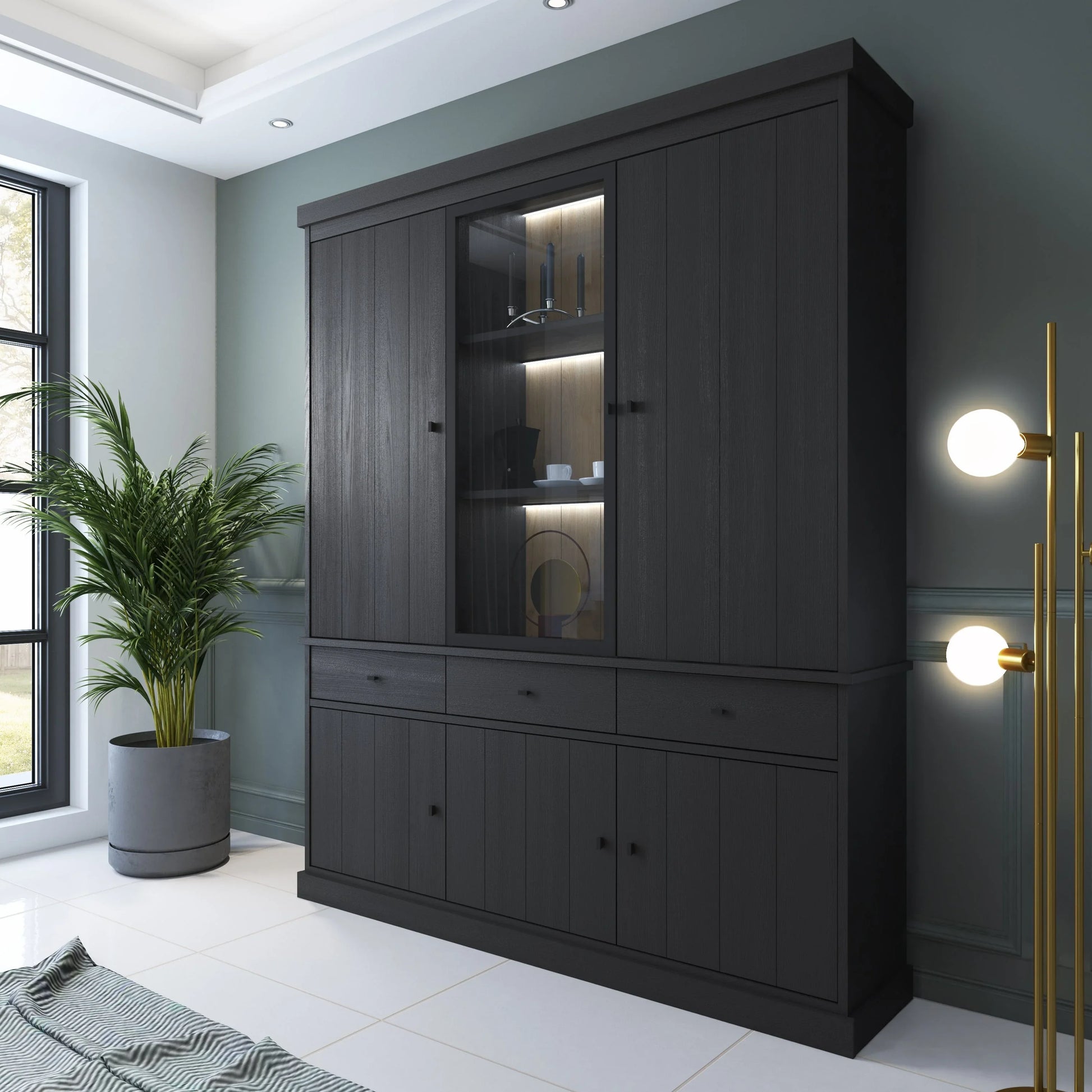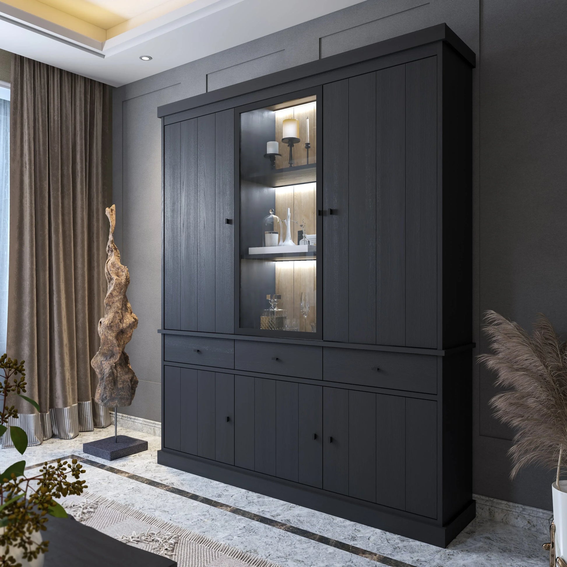 Bovenin heeft de vitrine twee grote gesloten deuren aan de zijkanten en in het midden een glazen deur met ingebouwde LED-verlichting. Dit biedt de perfecte balans tussen opbergruimte en de mogelijkheid om jouw favoriete decoratieve items tentoon te stellen. De LED-verlichting creëert een sfeervolle ambiance en laat jouw collectibles schitteren.