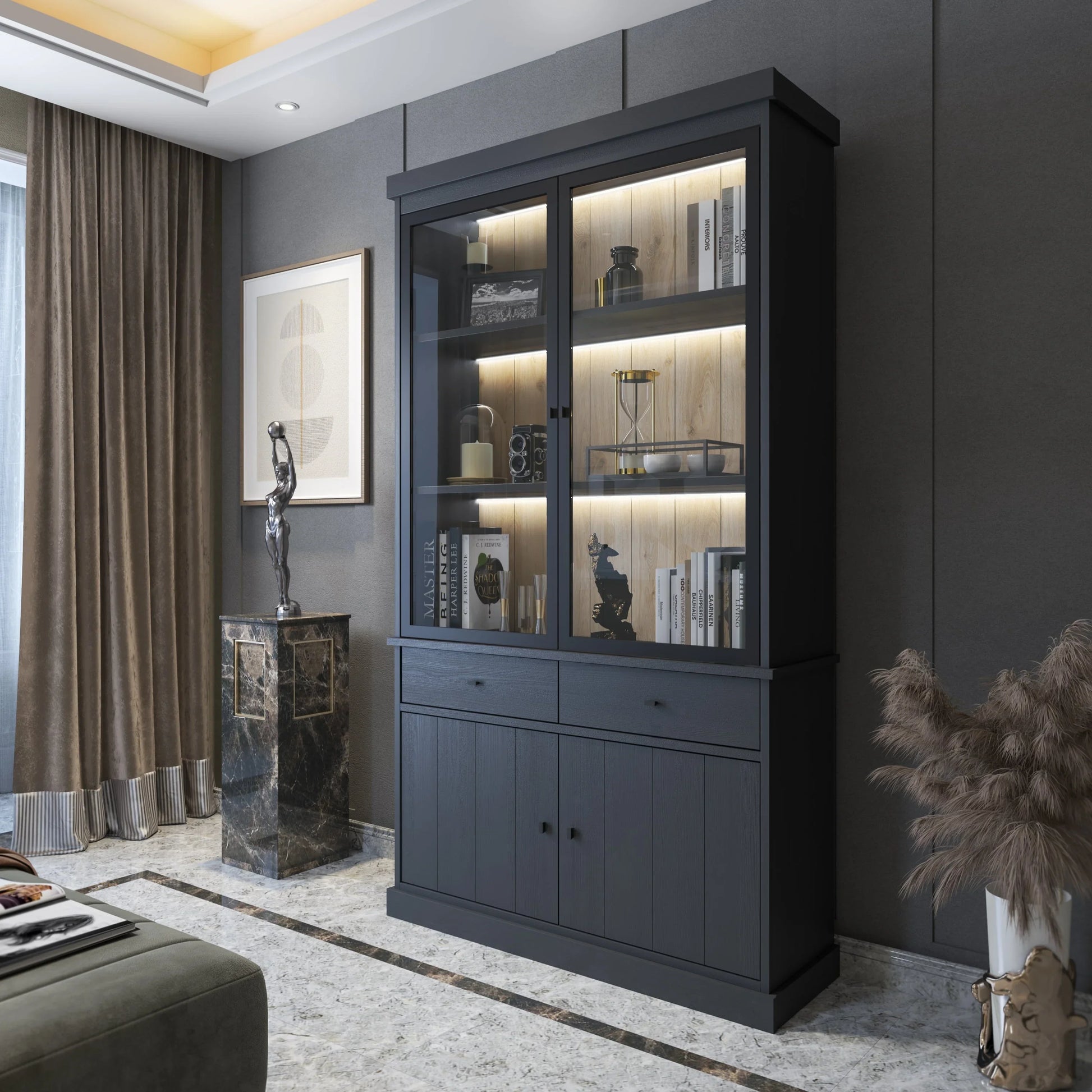 Bovenin is de vitrine voorzien van twee grote glazen deuren, waardoor je jouw favoriete decoratieve items tentoon kunt stellen. De ingebouwde LED-verlichting zorgt voor een sfeervolle ambiance en laat jouw collectibles schitteren.