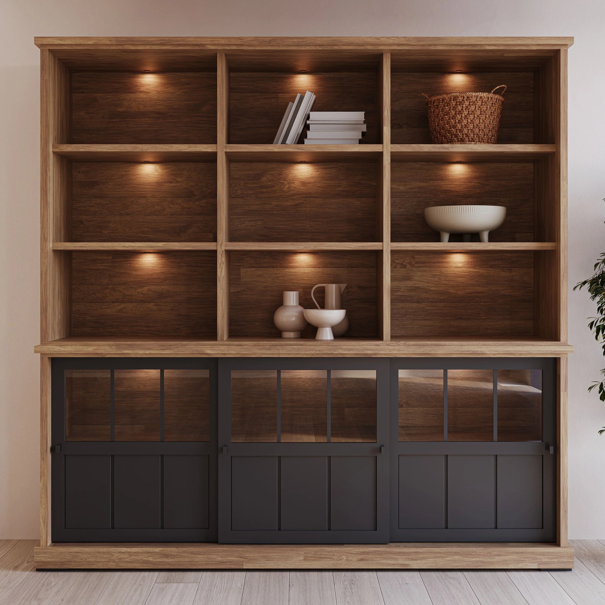 Wat deze wandkast echt bijzonder maakt, is de ingebouwde LED-verlichting. Deze subtiele verlichting zorgt ervoor dat jouw items prachtig worden uitgelicht, zelfs in de avonduren, en voegt een extra vleugje luxe toe aan jouw woonruimte.