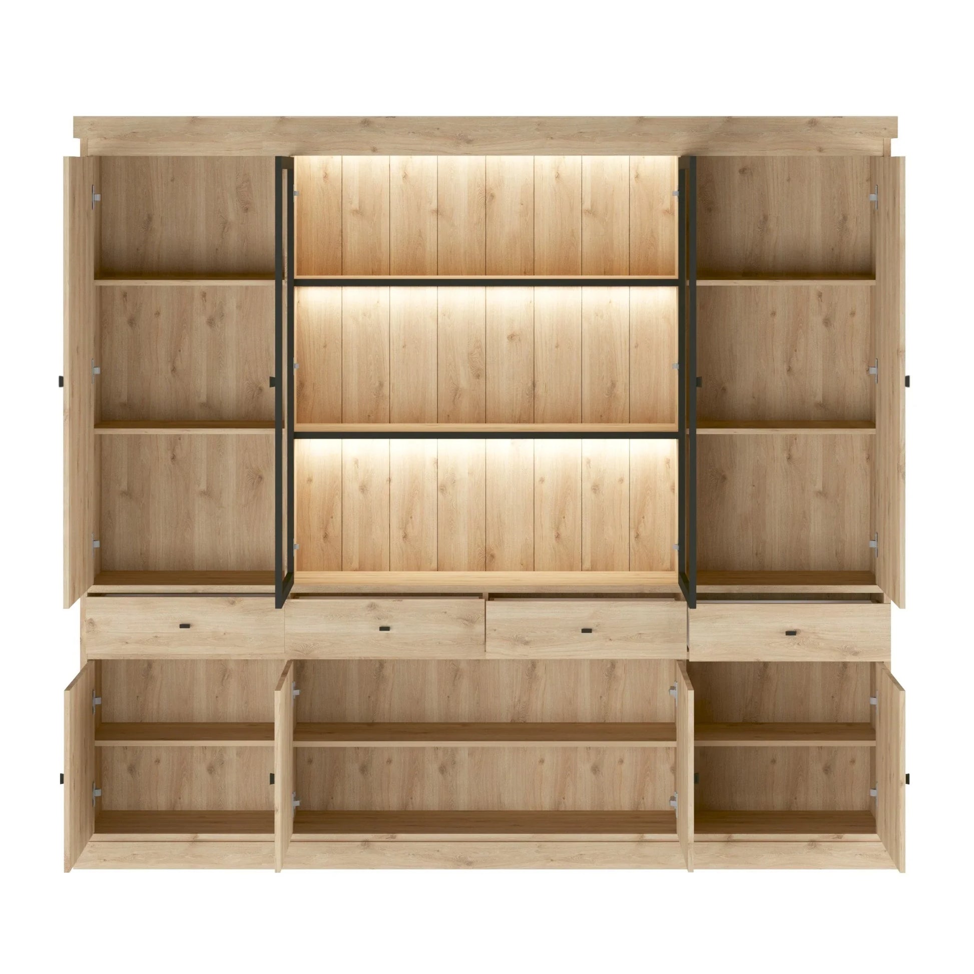 Bovenin heeft de wandkast twee grote gesloten deuren aan de zijkanten en in het midden twee grote glazen deuren met ingebouwde LED-verlichting. Dit biedt de perfecte balans tussen opbergruimte en de mogelijkheid om jouw favoriete decoratieve items tentoon te stellen. De LED-verlichting creëert een sfeervolle ambiance en laat jouw collectibles schitteren.
